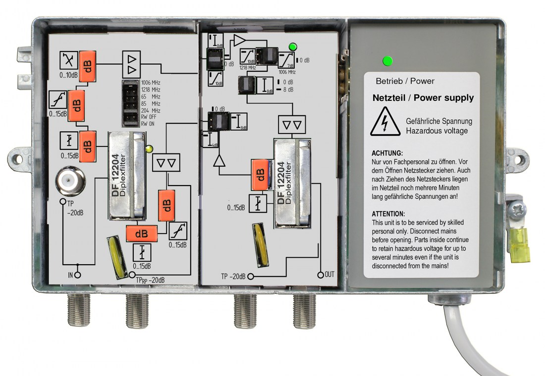 • 28 / 36 / 44 dB gain in the downstream (pluggable via jumper)