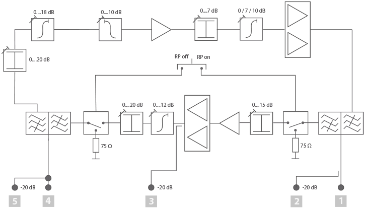 • Measurement points in input and output, in return path additionally before the adjustment elements in the output