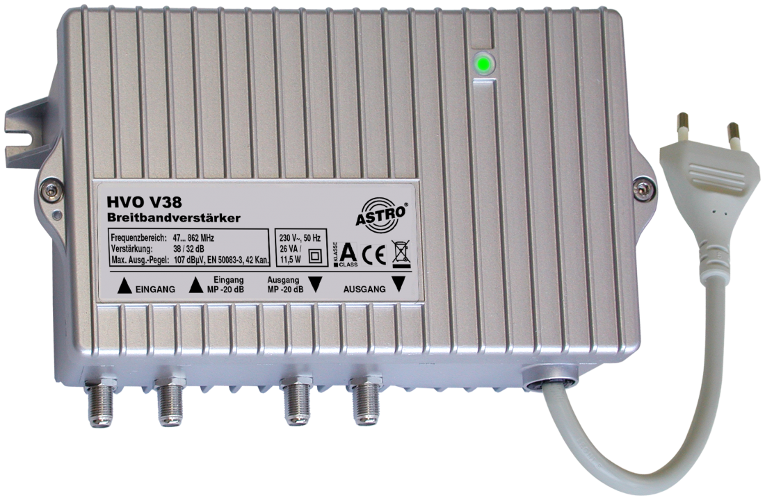 Broadband amplifier with 65 MHz return path, local powered, forward path to 1006 MHz, gain forward path 40 dB, output level forward path 111 dBµV, gain return path 30 dB, output level return path 112 / 117 dBµV (2 / 3 carrier), various configuration optio