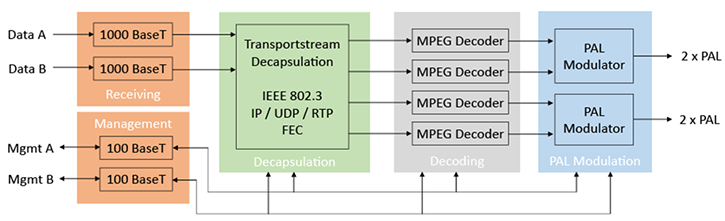 • for processing of up to 4 IP multicast groups of a Gigabit Ethernet MPEG TS in 4 standard PAL programmes