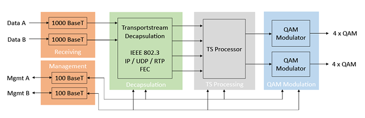• for processing of up to 8 IP multicast groups of a Gigabit Ethernet MPEG TS in 8 standard QAM channels