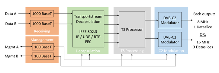 up to 24 IP multicast groups of a Gigabit Ethernet MPEG TS into 2 DVB-C2 systems