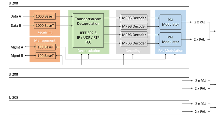 up to 24 IP Gigabit Ethernet multicast groups to 3 x 2 x 4 Standard PAL programmes