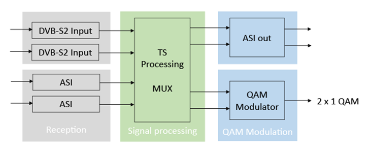 Signal converter 2 x DVB-S2 and 2 x ASI into 2 x 1 QAM and 2 x ASI