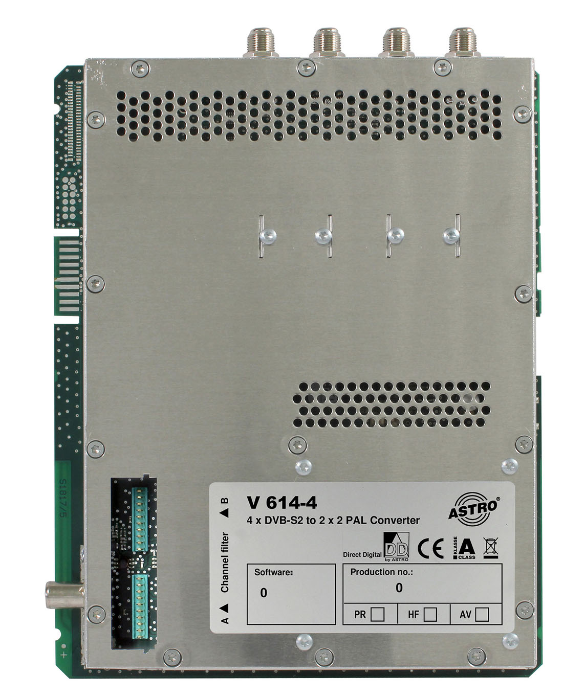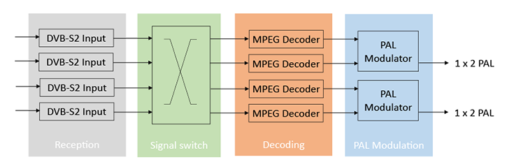 • processing of  4 independent  DVB-S input signals into 2 PAL adjacent channel pairs in the frequenzy range 47 to 862 MHz