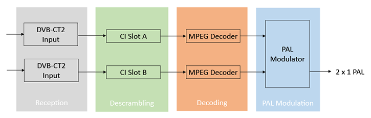 • for processing of 2 DVB-C, DVB-T or DVB-T2 signals into PAL