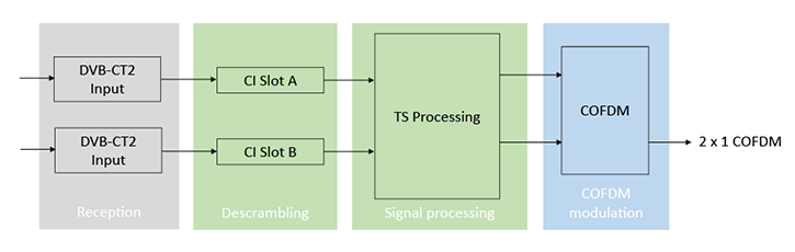 • for processing 2 DVB-C, DVB-T or DVB-T2 signals into COFDM