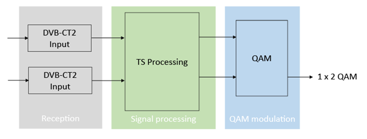 • for processing of 2 DVB-C, DVB-T or DVB-T2 signals into 2 QAM adjacent channels