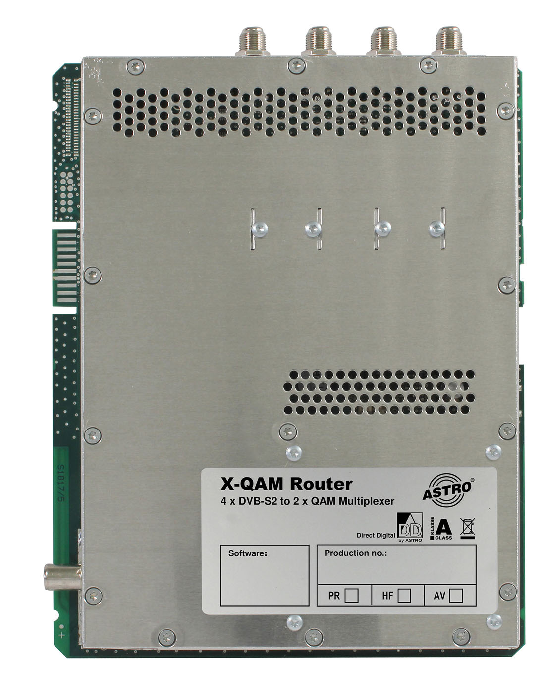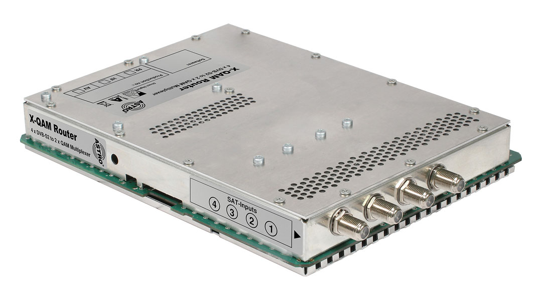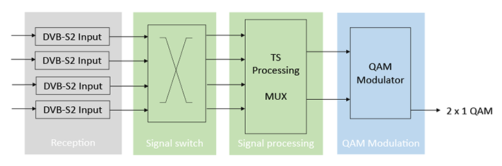 • multiplexing of 4 independent DVB-S(2) input signals into zwei independent QAM output channels