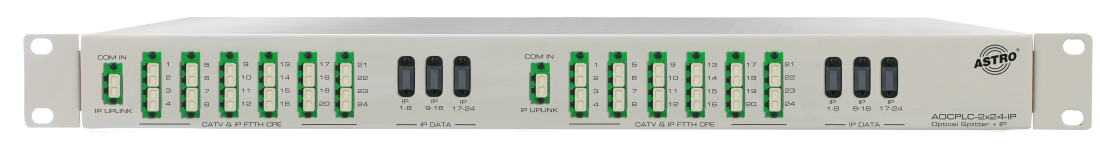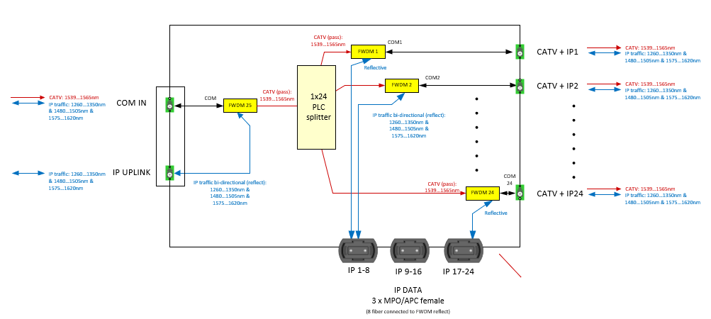 • Jeder der Verteiler mit: 1x COM Eingang für CATV und Data (LC/APC), 1x IP Port Abgriff vor Verteiler für WAN ETH Up-link Anbindung (LC/APC), 24x in/out CATV+Data (LC/APC), 24x in/out Data (3 x MPO/APC weibl. 12 GF - 8 innere GF angeschlossen)
