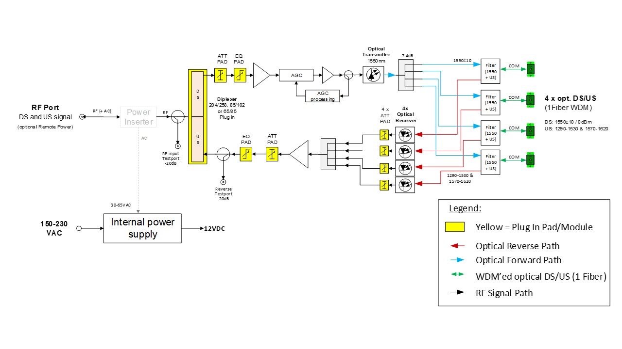 • Rückwegempfänger mit WDM über Diplexfilter ODS 65 (65/85 MHz) oder ODS 204 (204/258 MHz) als Option